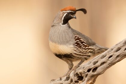 A covey of gambel’s quail scurrying through the desert with their topknots…