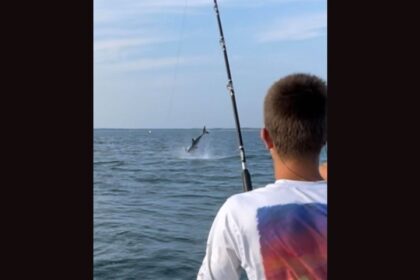 Great White Shark Goes Airborne While Snatching Striped Bass off Fisherman’s Line