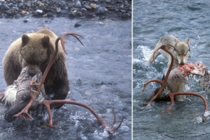 Epic Battle Between Grizzly Bears and Wolves Over a Caribou Carcass Caught on Camera