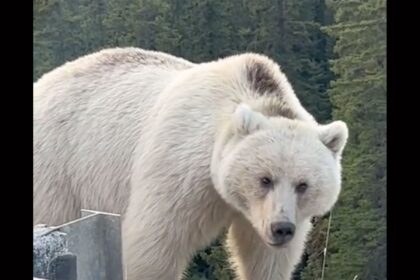 Watch a Rare White Grizzly Bear Graze on the Side of a Canadian Highway