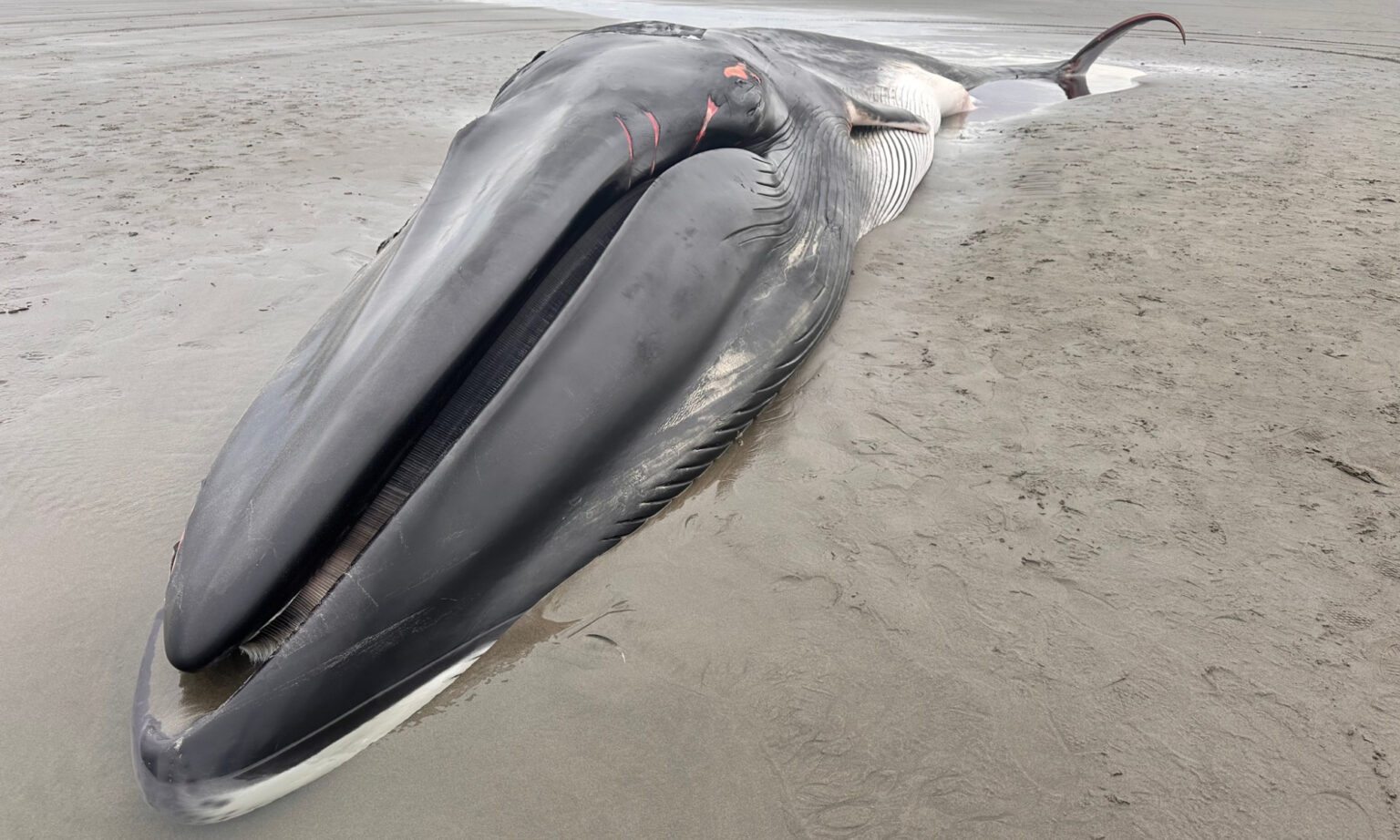 The fin whale was already dead when it washed up on the beach with its mouth open and baleen exposed. The moving tide made the whale appear to still be alive, Seaside Aquarium says in a Facebook post about the situation. This might have prompted passersby to untangle the whale, which ended up doing more harm than good.