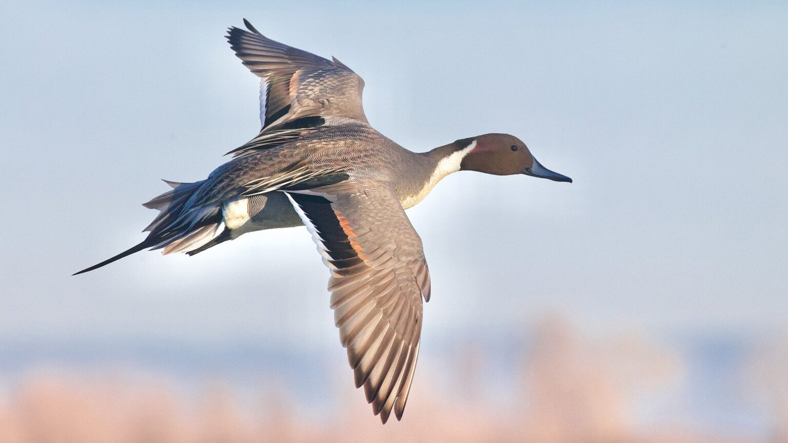 Early migrants, pintails get a jump start on both their spring and winter migrations. They nest near seasonal and semi-permanent wetlands in the prairie pothole states, and also nest farther north in the tundra. They can also nest in tilled ag fields. The hens prefer to make their nests in low, sparse vegetation, where they lay an average clutch of eight eggs. Like most duck species, pintails hatch within about three weeks after the eggs are laid, and the chicks are ready to fly at six weeks or so.