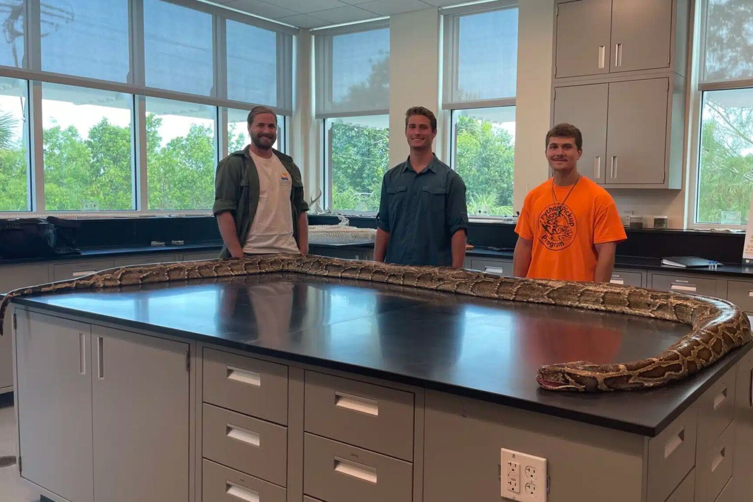 The press release credits 22-year-old Jake Waleri of Naples with finding the massive snake somewhere inside the Big Cypress National Preserve—a 729,000-acre swamp that’s home to a diverse array of native wildlife species, including the endangered Florida panther. “We brought the snake to the Conservancy to be officially measured and documented. We wanted to donate this find to science,” Waleri said. “It’s awesome to be able to make an impact on South Florida’s environment. We love this ecosystem and try to preserve it as much as possible.”