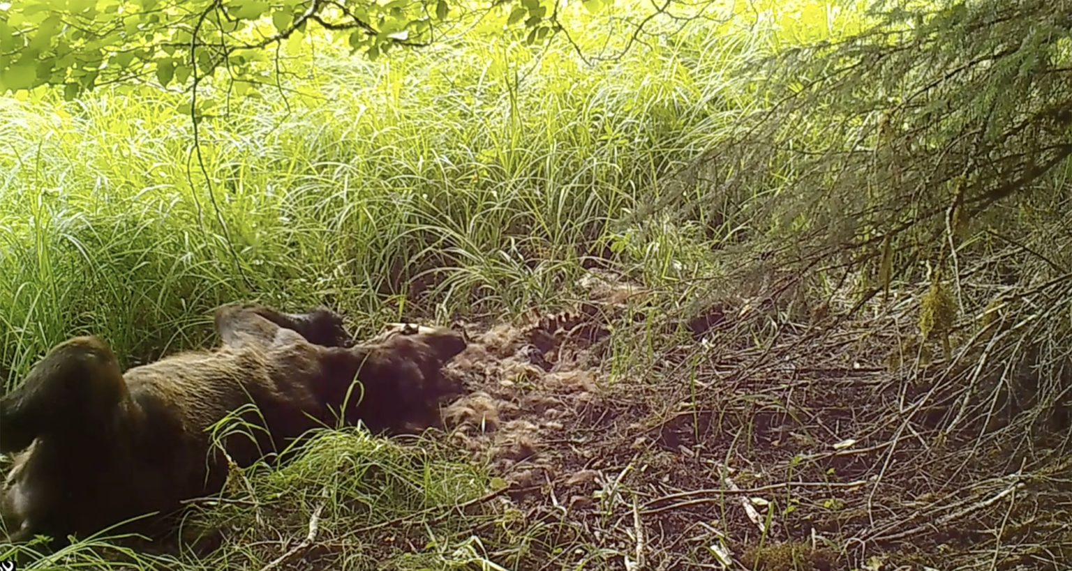 He was the only adult bear to roll on the remains. Two tiny spring cubs also indulged, but their mother huffed at them from outside the video frame the whole time. I’m not saying that’s enough evidence to label the bony boar as the killer, but it’s enough to make me wonder.