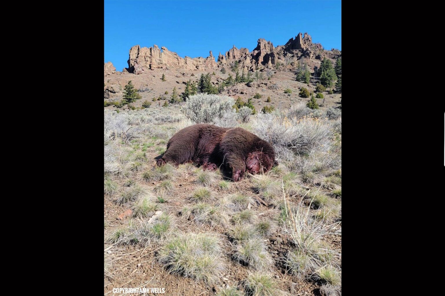 Cody-based wildlife photographer Amy Gerber was one of the first people—aside from Wyoming Game and Fish Department personnel—to observe the scene on the morning of April 2. “I drive that road every single day to go out and do nature photography near the East Gate,” Gerber tells Field & Stream. “When I pulled up, the Game and Fish guys were there. They wanted to know if I’d seen anything suspicious in the morning. They were combing the hillside behind the bear looking for evidence.”