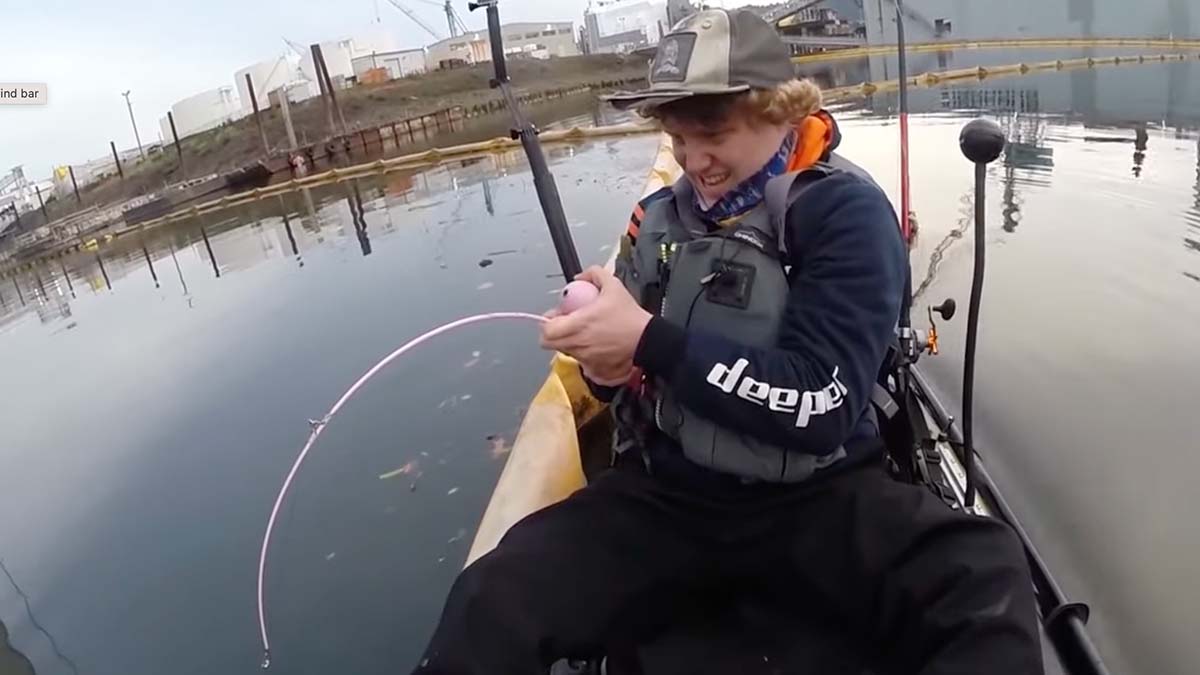 The video in question was posted on YouTube by “NorthWest Fishing” in July 2021. The fisherman, who did not share his real name, is a seemingly normal guy out to try his luck fishing in the middle of downtown Portland, Oregon, at the Swan Island Ship Yard. For one thing, the weather report was wrong. It called for 38 degrees but it’s warmer, and the guy has on too many layers as he paddles his kayak out. Then, he realizes his fishing spot has too many big boats. And, because things aren’t dismal enough, he decides to break out a Barbie fishing rod. It’s all of 2 feet, 6 inches long of the highest quality plastic. It comes pre-spooled with God only knows what kind of line and costs a whopping $15.