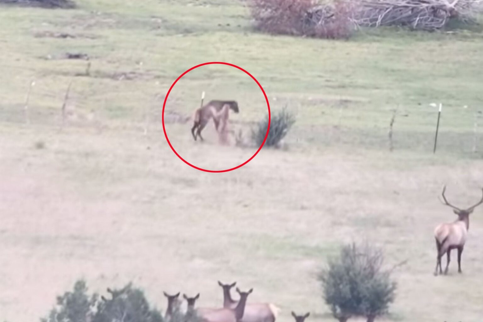 This is brutal. A recent video recorded by Jerritt Wybron in Arizona shows rare footage of a mountain lion preying on a young elk. The video, which appears to have been taken through a spotting scope, shows the lion hot on the heels of the calf. They run in a circle through a meadow as the rest of the elk herd watches.