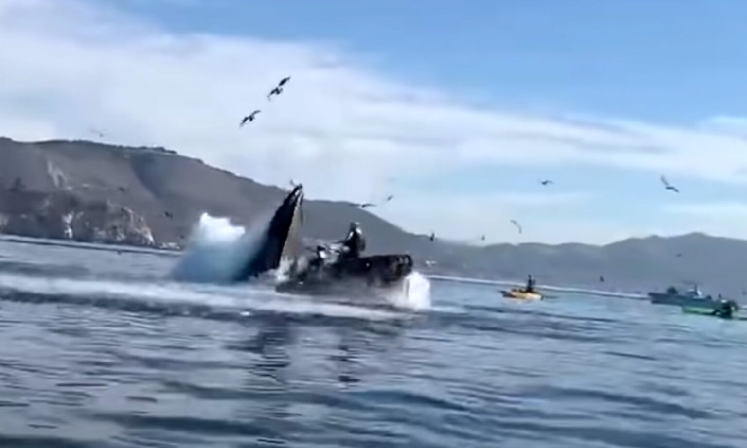 The video, which was recorded by another whale-watcher on a different vessel, shows Cottriel, McSorley, and the other boaters looking on as the humpbacks breach the surface to gorge on balls of baitfish. Cottriel and McSorley suddenly find themselves in the middle of all this bait as a whale breaks the surface directly underneath them, its giant mouth agape. The whale appears to swallow the kayak whole before it closes its mouth and falls back into the ocean.