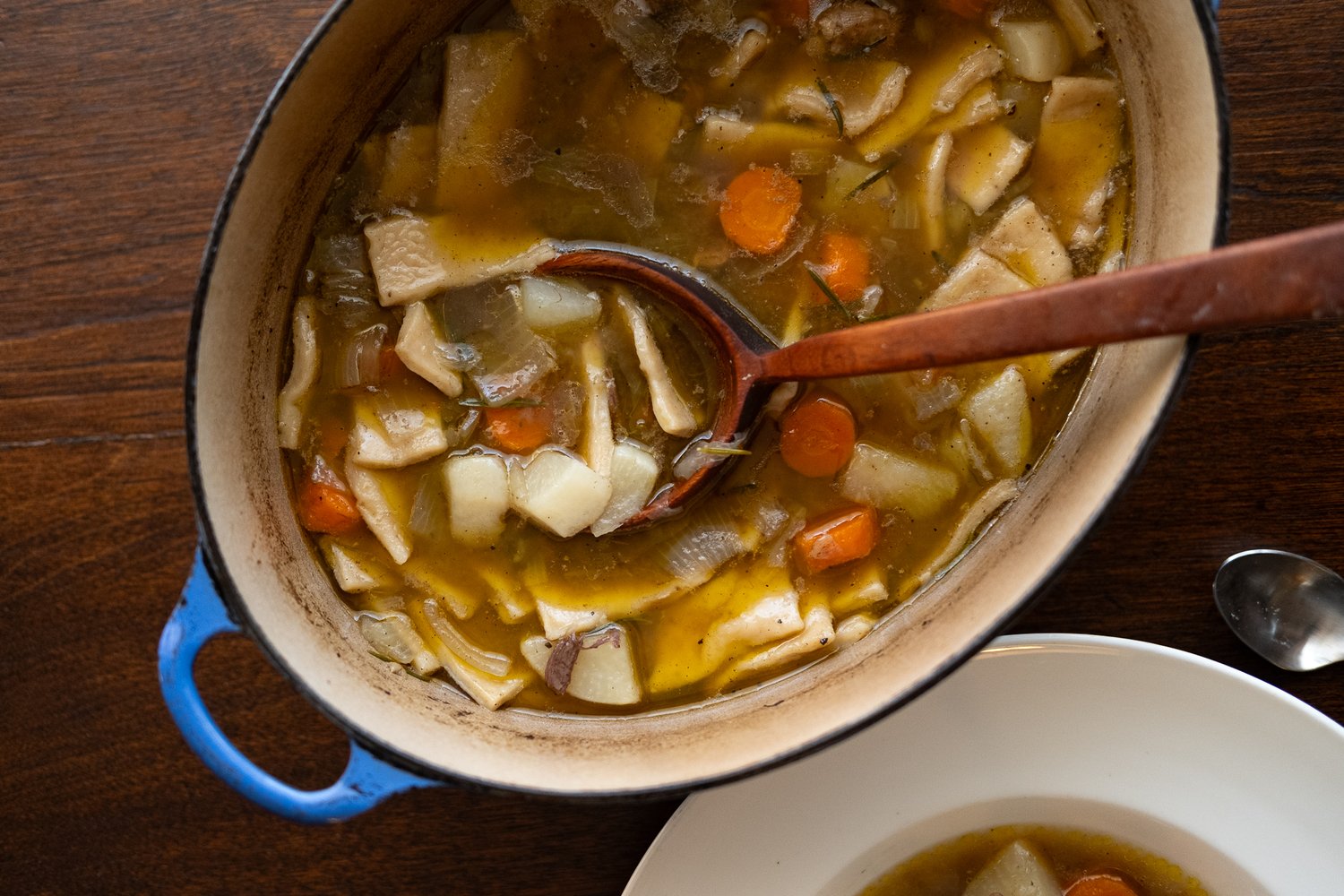 We wanted to attempt this again, so we found a few different, more modern, recipes for “slick” dumplings and set to work. Slick dumplings should sink in the broth, no leaveners, unlike “puff” dumplings that float (the type we use in our goose oh-my-gosh recipe). These slick dumplings are just flour and water, rolled out and sliced like wide noodles, just like the ones I grew up eating in chicken and dumplings.