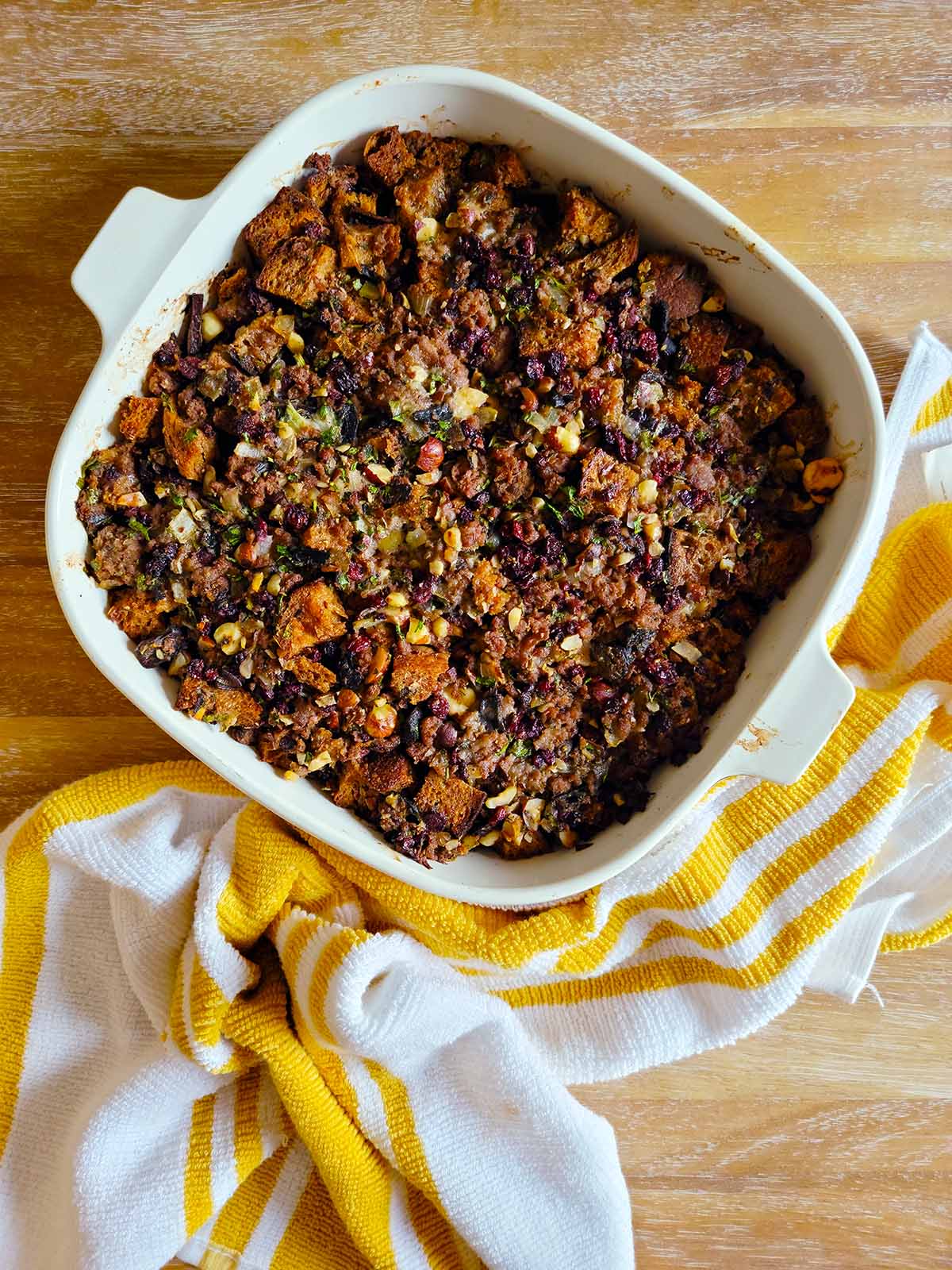 This is a simple recipe for cranberry sausage stuffing that has lots of variations depending on what you have on hand. Sausage, sage, stale bread, nuts and dried berries are the stars. You can vary the meat, bread, nuts, and berries, as you’ll see below.