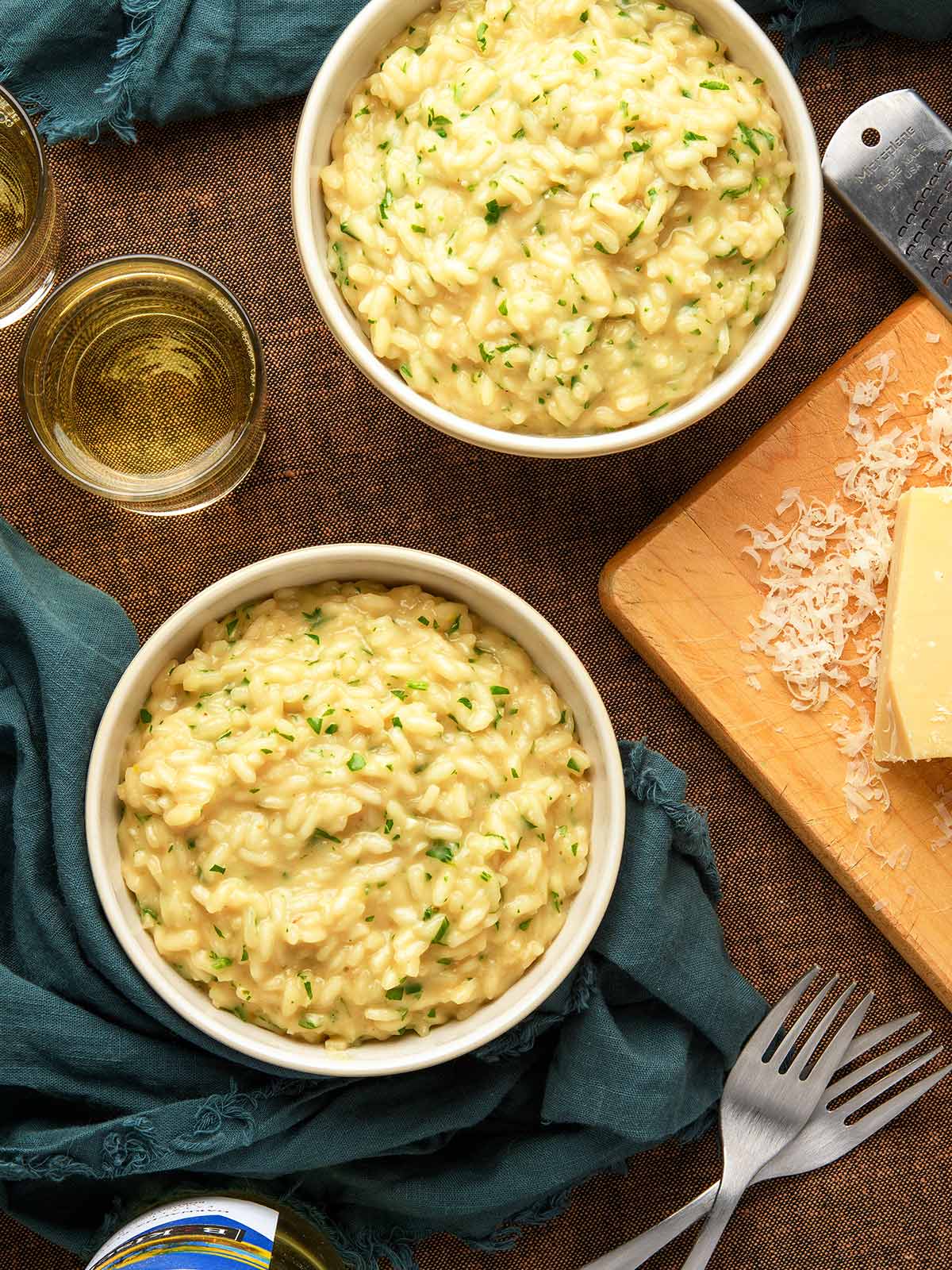 Garlic parmesan risotto should be the first recipe you learn when you want to make risotto: It’s easy, there are no hard-to-find ingredients, and the result will make you want to make this Italian classic over and over.