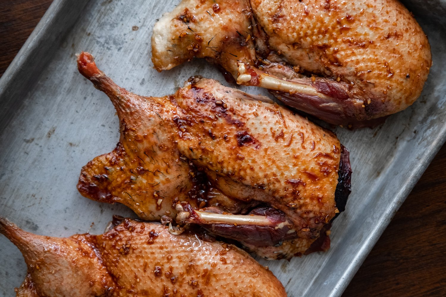 We make smoked duck many different ways, but they all follow the general technique-; a brine, followed by a low heat smoke. For this honey-soy smoked duck, we add some soy sauce to a very simple brine, then glaze the duck with a mixture of soy, honey and garlic. This gives the duck a touch of eastern flavor, while remaining neutral enough for just about any dish. This smoked duck breast goes perfectly on some ginger-scallion udon noodles or over winter greens with dumplings.
