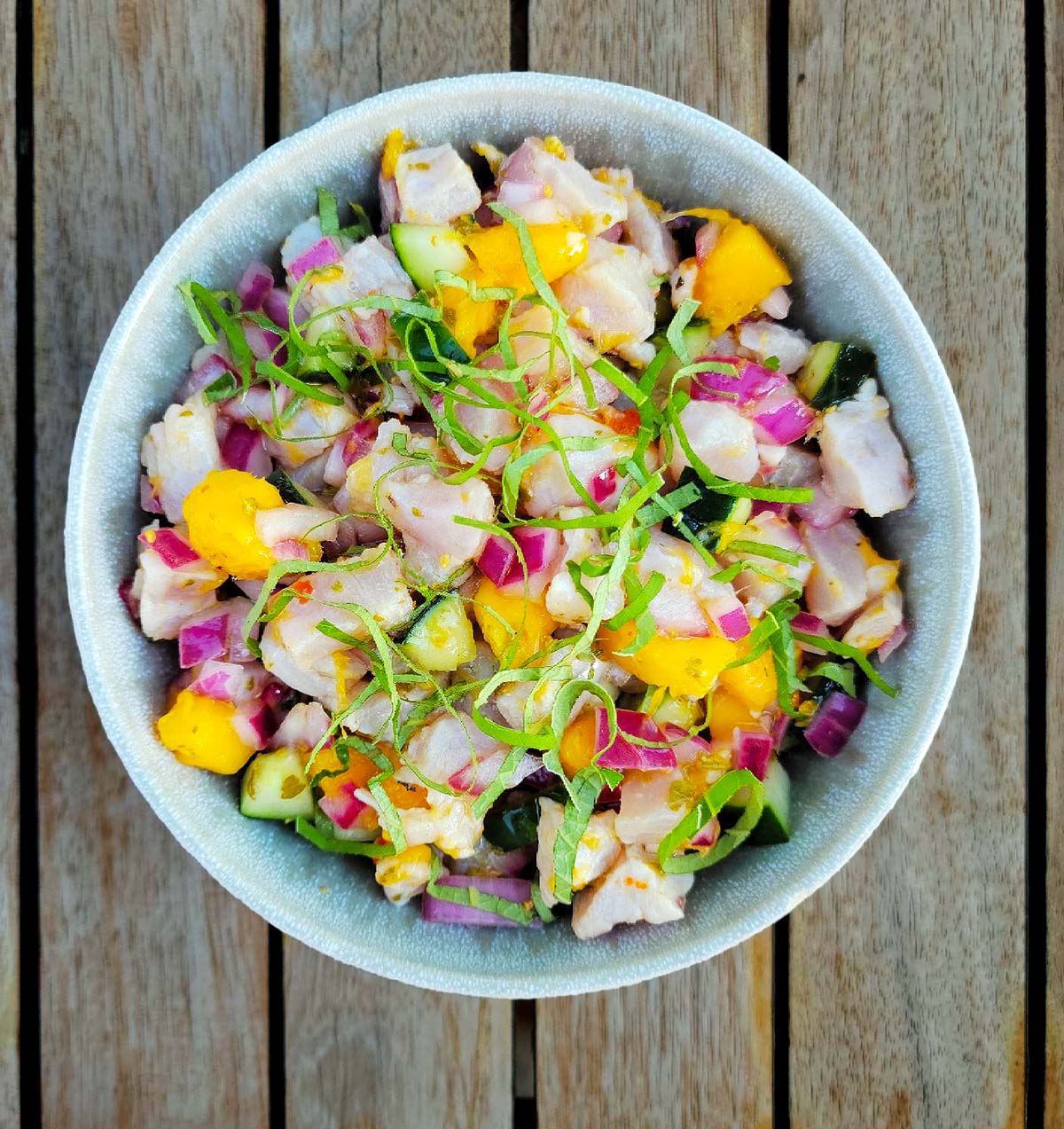 This mahi mahi ceviche is inspired by the little casita I stayed at in Todos, Santos, about an hour north of Cabo San Lucas, in Baja. Mango trees grow all over property, and the town — there was a mango festival while I was there in July.
