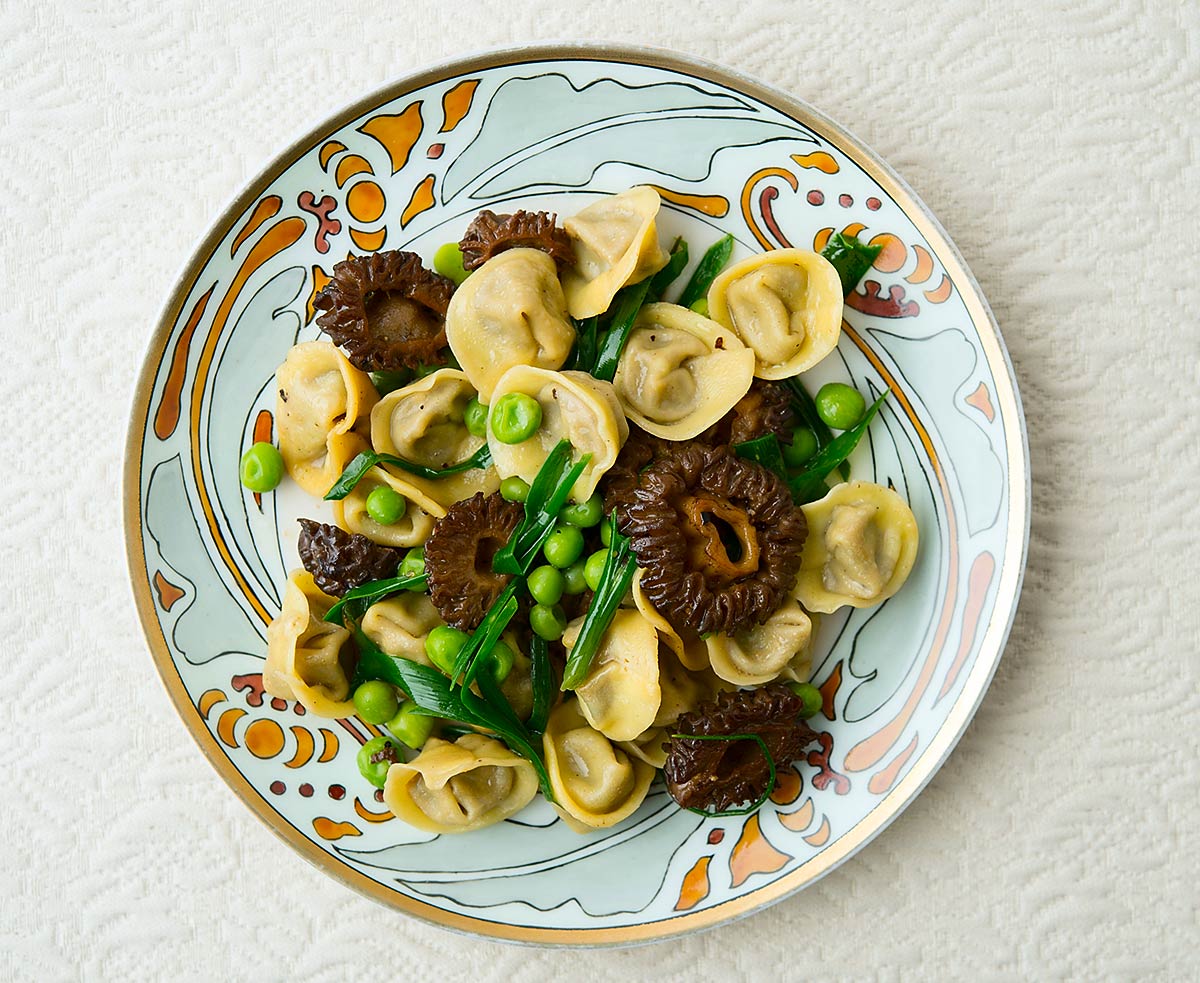 Mushroom tortellini, little packets of love, are one of the finest expressions of care and calm that I know of. Pureed mushrooms in little packets of pasta, served with more mushrooms, peas, some green onions — and lots of butter.