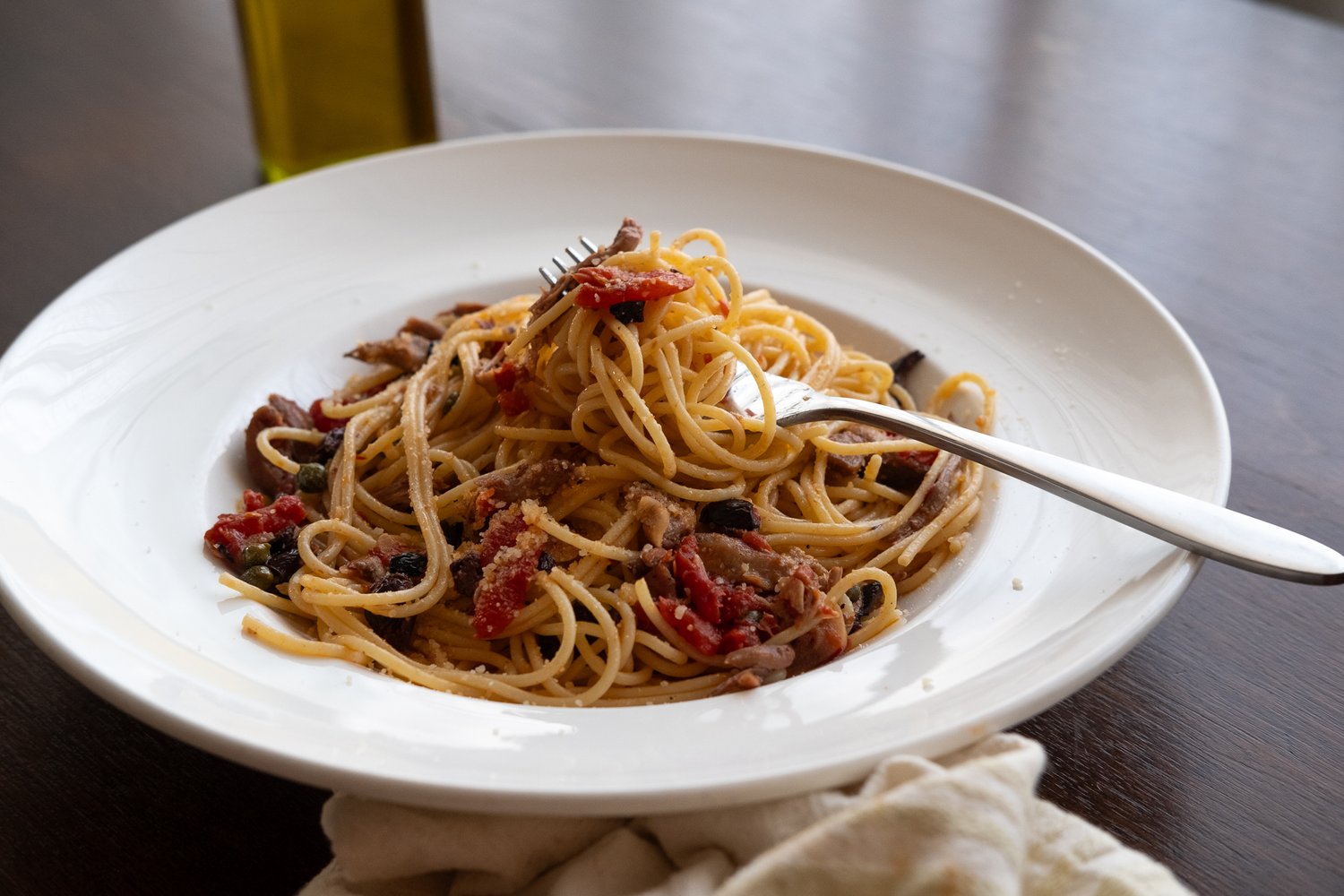 In a large sautee pan over medium heat, add about ¼ cup of evoo, garlic and anchovies. Stir and cook until fragrant and garlic is tender, about 3 minutes. Add in drained tomatoes and stir, cook for another 5-8 minutes until incorporated and semi sticky. Add in olives, capers and red pepper, cook for another minute. Fold in pheasant, heat until warm and toss with pasta.