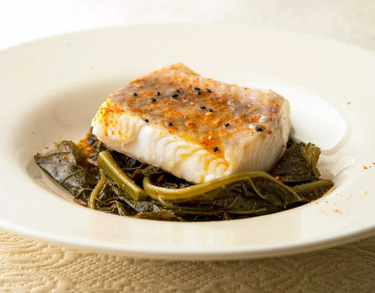Go sour or spicy. You poach fish to bring out its delicate flavor and for health reasons: poached fish is arguably the most healthy way to cook fish. But you’ll want a counterpoint somewhere on the plate. In the case of this recipe, I used some pickled mustard greens under the fish, along with just a sprinkle of togarashi, a Japanese spice mix.