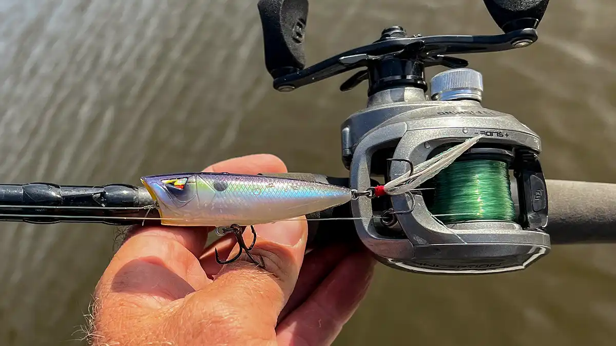 But there’s one particular drawback to braid with this type of bait— it tangles in the front prop. These baits are designed to be twitched along the surface. The props spin as the bait coasts forward after each twitch, the front prop often tangling in the limp braid as it spins. You can use a short, 6-inch mono leader though to prevent this. The stiffer (but still buoyant) mono stays out in front of the prop (while also still keeping the nose of the bait up).