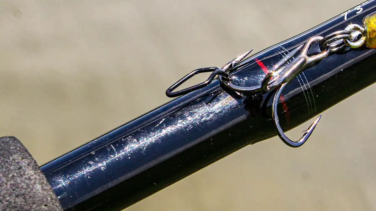 For any who have read a rod review of mine in the past, you’ll know that last detail is always one of my favorites. I really like open bait keepers because they accommodate all types of baits. You can easily hang baits with exposed hooks, like jigs, spinnerbaits and lures with treble hooks. And, unlike with closed hook keepers, an open one also allows you to hang rigged soft plastic baits like Texas rigs, Flukes and topwater swimbaits, with their hook points still covered.