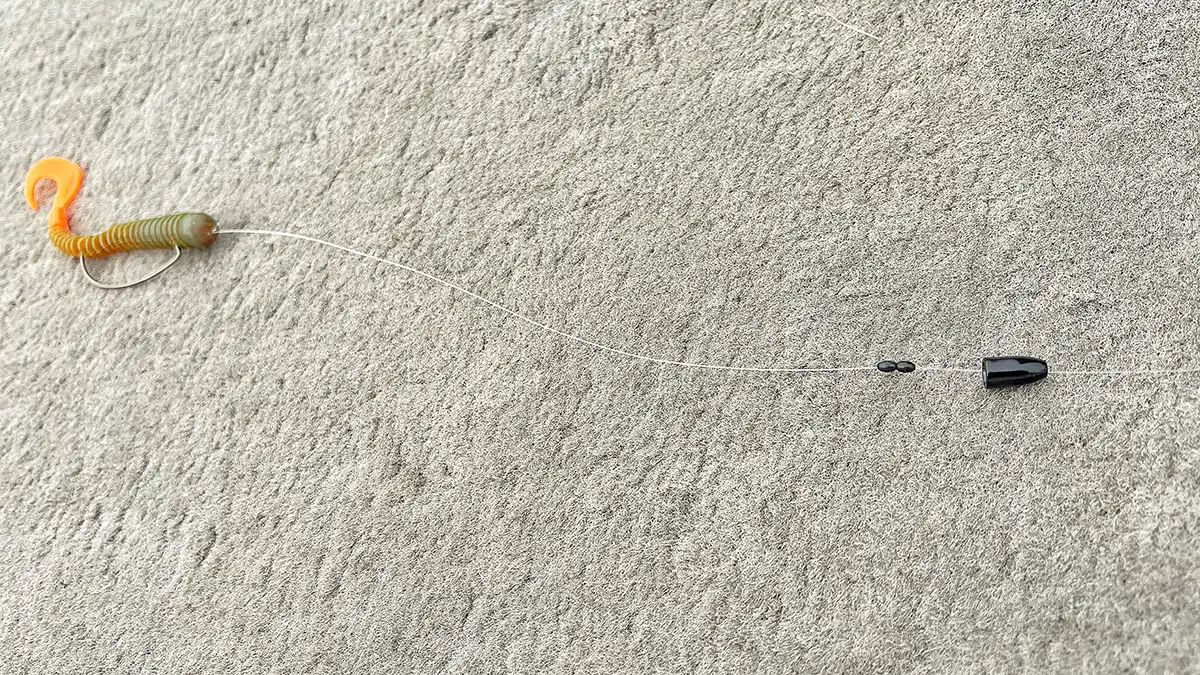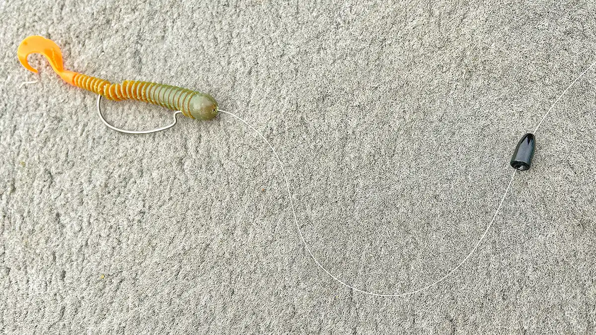 Texas rigs are as simple to rig as they are effective. Just slide the bullet weight on with the line passing through the pointed end fist. Then tie on an offset shank worm hook and slip your favorite lizard, worm or other soft plastic onto the hook and you’re ready to fish along the bottom at a wide range of depths.
