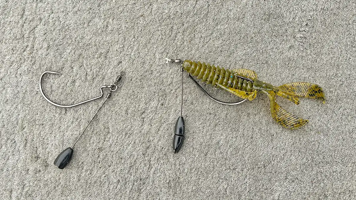 You can either slide one bullet weight up onto the wire (pointed end first), or you can use two smaller bullet weights—the first pointed up and the second pointed down. The latter way of rigging creates a slimmer presentation with a point on either end of the combined weights, which sheds grass and muck better than one bulkier weight would.