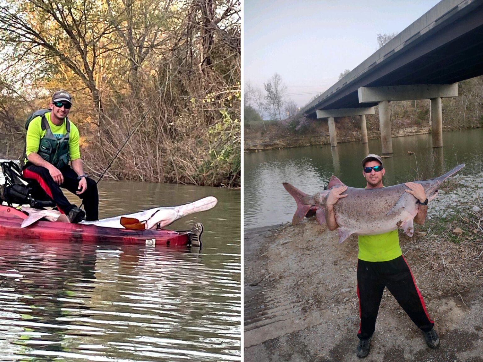 Murphy was in for a brutal battle. Landing a 100-plus-pound fish on 12-pound test is hard enough, but when that fish is foul-hooked in the tail, trying to control it is nearly impossible. He fought the spoonbill for over an hour as it dragged his kayak up and down the White River. He struggled to move the fish off the bottom and keep it out of heavy cover along the shoreline.