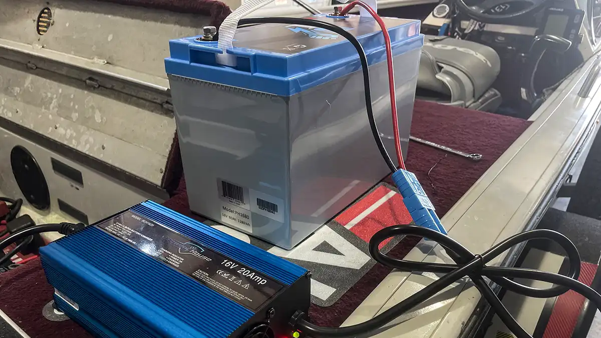 Terry Brown has been running the PowerHouse Lithium battery system in his boat and raves about how clear and bright his graphs are while fishing all day without any interference or stepping down while the motor is in use. He paired it with a PowerHouse Lithium Run and Gun 16V Charger so he can charge his batteries on the water and off.