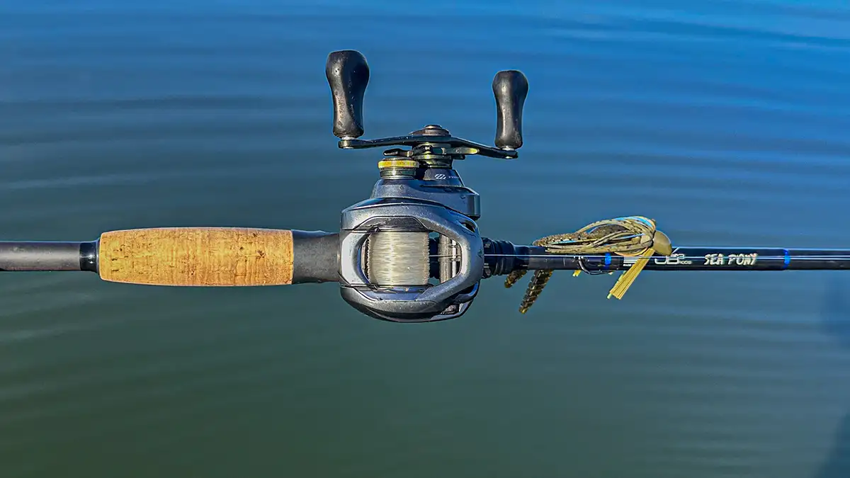 For a reel, one with a deep spool and high gear ratio is ideal for this scenario. The deep spool allows for lots of heavy gauge line. This leads to longer casts and a faster retrieval speed. The high gear ratio allows you to quickly pick up line when fighting fish to the boat. It also helps deliver a better hookset after being slack lined by a bass. One of my go to reels for fishing a jig offshore is the Shimano Curado 200 DC in the 8:1 gear ratio.
