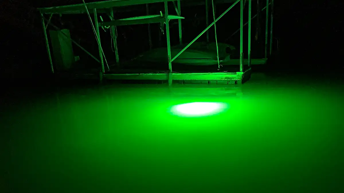 Green lights are submerged lights often found around, docks, marinas or big yachts that are sunk for the purpose of attracting fish. These lights can be found on nearly any body of water across the country. They are common in both fresh and saltwater, and attract fish of all kinds. There are many different kinds of lights that attract fish such as overhanging lights or spotlights, but not often are they submerged under the water. By submerging a light it allows the fish to locate it from a greater distance, often leading to a larger congregation of fish.