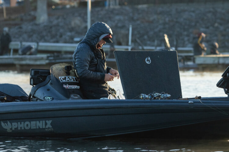 At the end of the day, it would surprise nobody if the winner watched all their fish bite on live sonar. But, the Tennessee River isn’t making it easy – recent rains have the current rolling, at 99,000 cfs on Day 1, and that has changed the complexion of the lake.