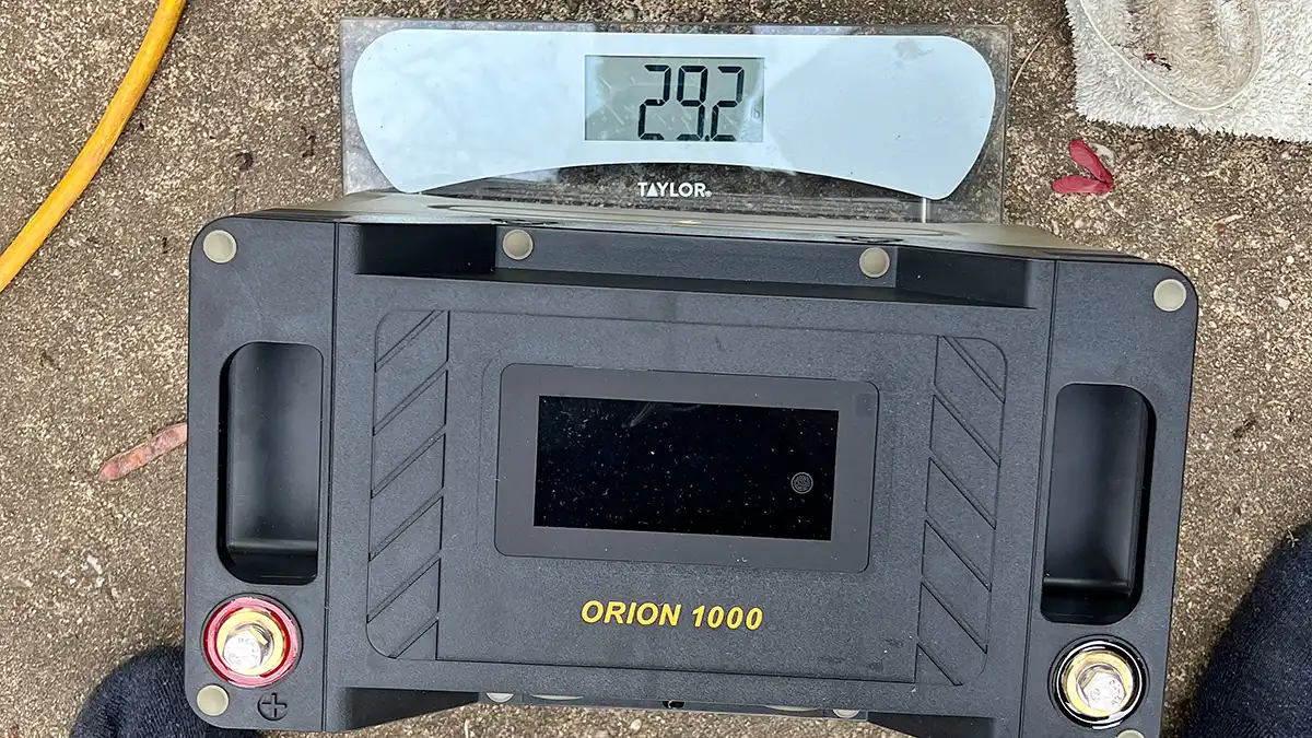 The Orion 1000 has two sturdy handles for easy transport and maneuvering down into the boat as well as padded low-profile feet on all four corners, to keep it from sliding around. I weighed it myself and it clocked in at 29.2 pounds. I love how light this battery is after wrestling with lead-acid batteries all these years.