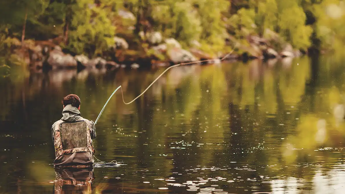 Fly fishing should be relaxing, so take the tension off your hand. Hold it firm but not a death grip. Stand with your feet shoulder-width apart, slightly angled toward your target. Eventually, you’ll find your own comfortable stance, but try this stance for starters.