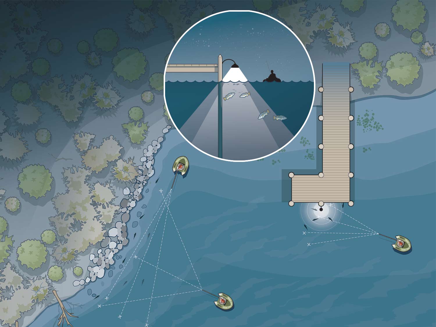 Any well-lit dock, bridge, or pier is a night angler’s dream, but you can’t just barrel in to pound the brightest spot. Light travels through the water in the shape of an inverted cone, so be aware of the illuminated water that extends out beyond the lit surface. Position yourself well away from that area to dredge midcolumn depths first, casting large streamers or jerkbaits with erratic movements. Once you’ve picked off the subsurface feeders, it’s time to froth the top with buzzbaits, walking baits, and chuggers.