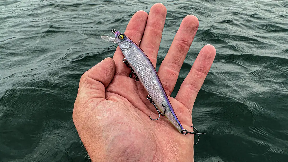 When fishing deeper water, I tend to opt for the Megabass Vision 110+1. This bait has a larger bill allowing it to dive to deeper depths while still maintaining its erratic action. This bait also suspends perfectly and can reach depths of 8-12-feet depending on your line size. When fishing these deeper diving jerk baits, I will often add bigger hooks allowing the bait to slowly sink. The larger hooks add more weight to the bait causing it to turn from a suspending jerkbait into a slow sink. This also helps with keeping fish from straightening out your hooks when fighting a larger sized bass.