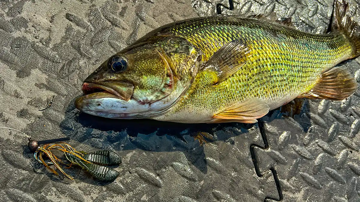 The biggest bass I’ve caught using the PeeWee Spider Jig HD so far was a spot pushing 3 pounds, but I’d trust this hook with a 5-pound-plus fish no problem. Anything over 15-pound test fluorocarbon would really overpower the finesse situations that you’d likely want to use this bait in— so I’d say that you’d have a better chance of breaking your line on a fish that you would bending this hook out.