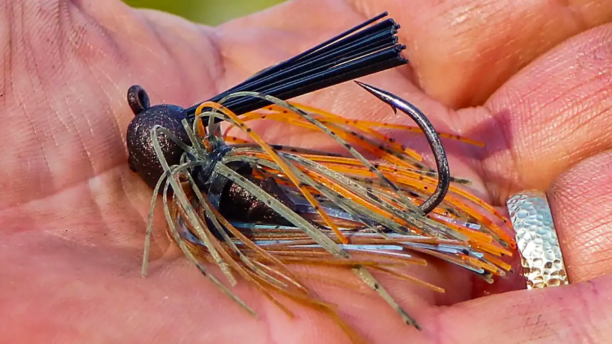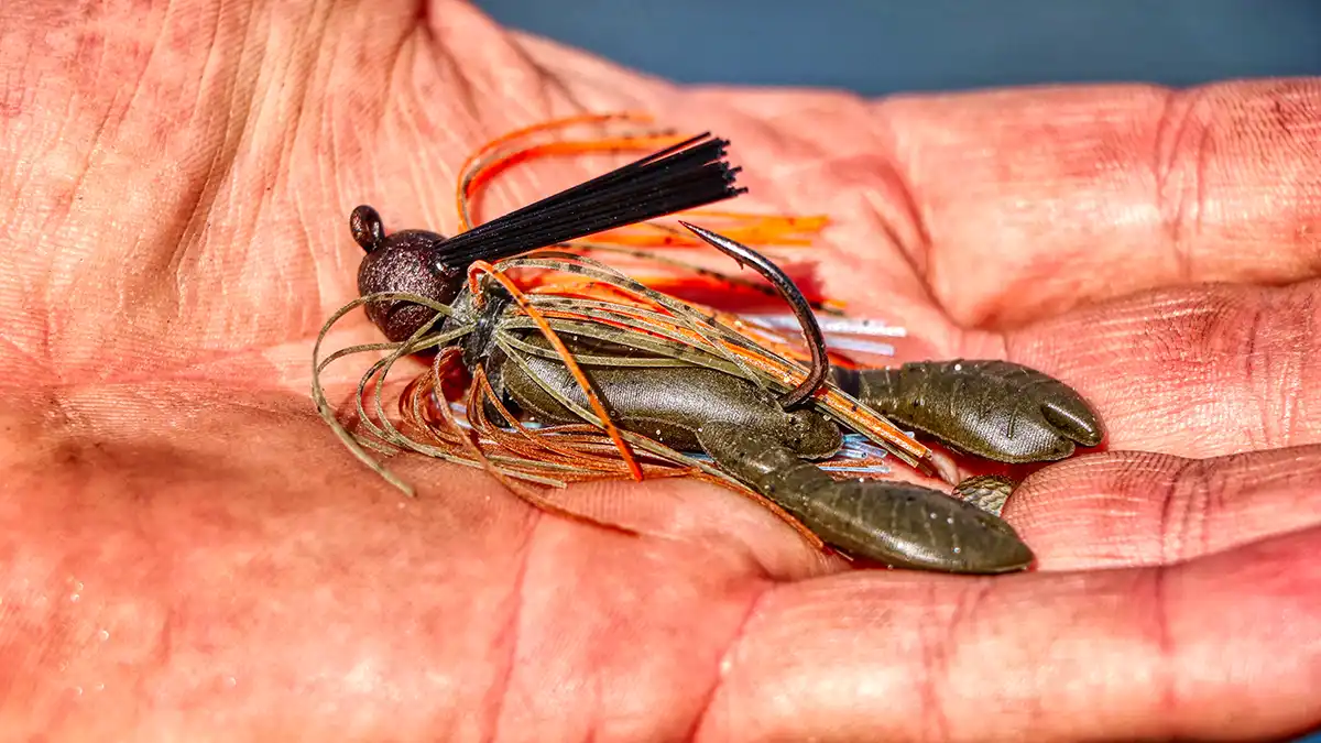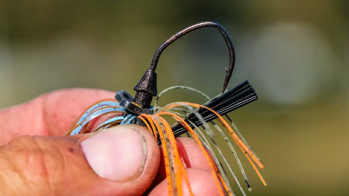 Jewel used their signature Pro Spider Jig head design with this bait. It’s almost a round head, with an upturned eye to help the bait come through rocky terrain and over cover. There’s what I would call a mid-size and mid-strength weedguard molded into the head of the bait, with about 20 bristles that are soft enough to allow for a light hookset but stiff enough to keep the hook from prematurely punching into anything, like cover.