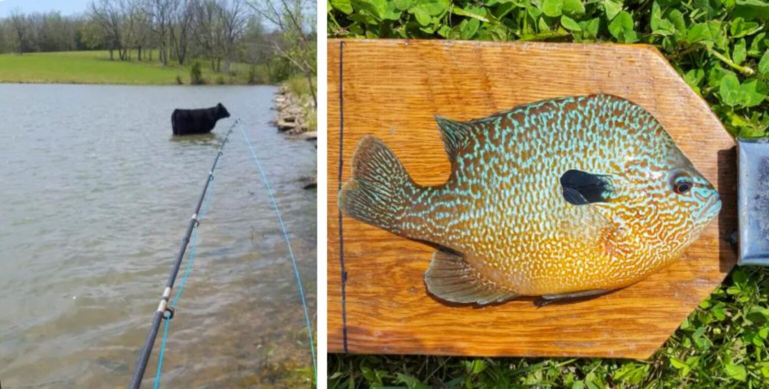 Goad shares the honor of his record longear sunfish with a yearling cow who needed a drink. John Goad, via MDC