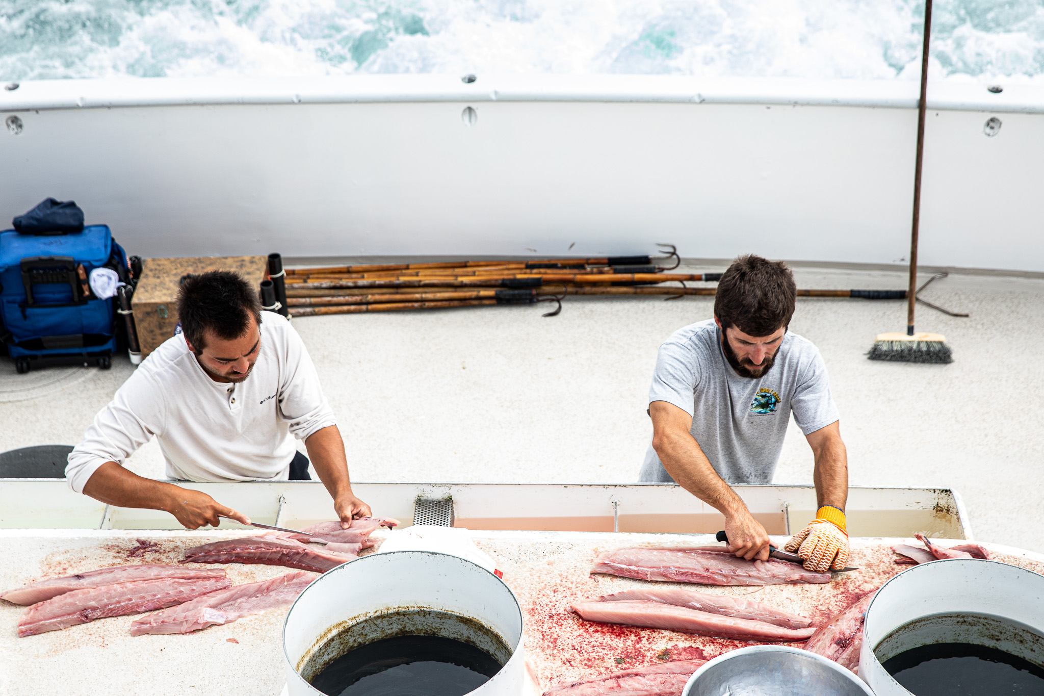 According to Kraft the average charter deckhand is more educated than ever about how to best care for fish while at sea. That starts with careful gaff placement to avoid ruining meat. As soon as a fish hits the deck (gently, so as not to bruise the meat) a deckhand dispatches it with a spike to the brain or spinal cord, which kills the fish quickly and reduces thrashing, which can stress the meat. Next, the gills and guts are cut away and the blood drained to preserve freshness and flavor. Finally, the fish are stored in the SOA‘s chilled refrigeration system.