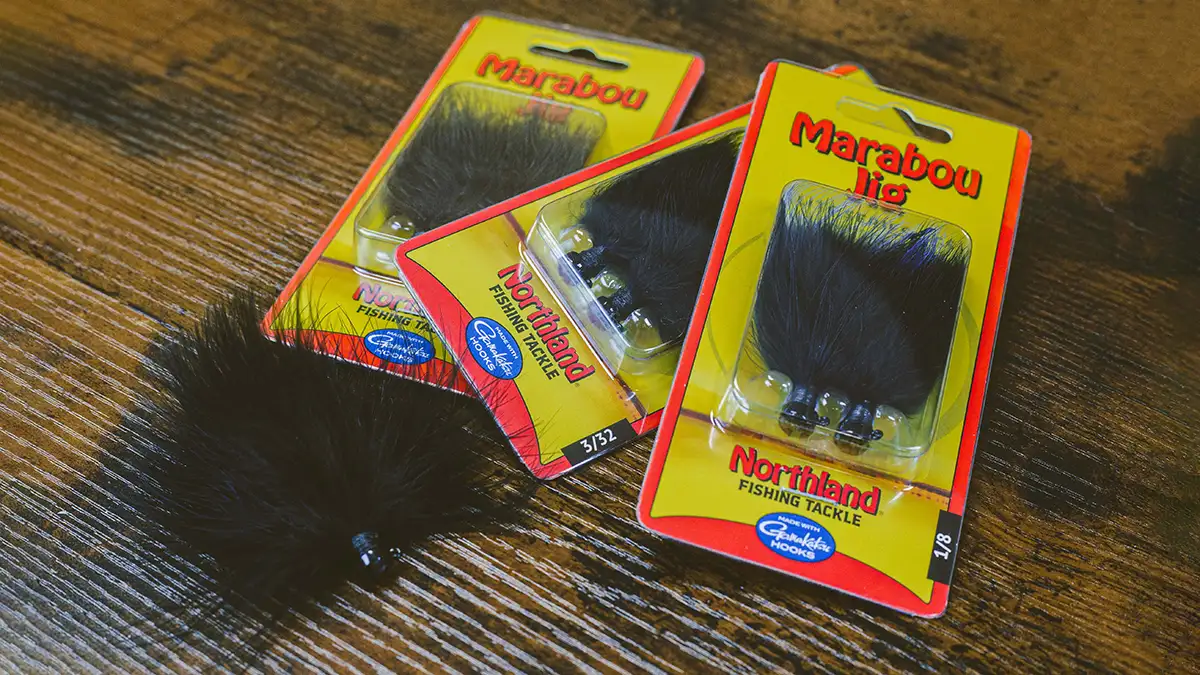 Still handtied, but now produced in mass, Northland’s Elite Series Marabou Jig features premium marabou feathers meticulously wound onto a strong, shockingly sharp, Gamakatsu® hook with bait keeper. They are available in three proven, earth-toned patterns and three sizes – 1/16, 3/32, and 1/8-ounce.