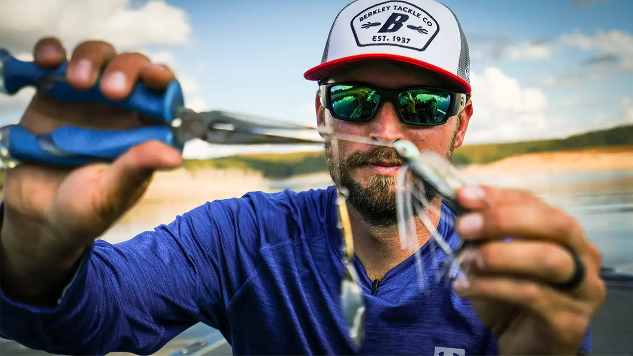 Lucas explains the importance of adding a small split ring to the eye of your light-wire spinnerbait. He’s a fan of the Berkley ones for their light wire and resulting high vibration coupled with the PowerBait scent profile. However, the light wire also means the spinnerbait is less durable than heavier wire baits. By adding the split ring, Lucas significantly increases the durability by reducing excess flex. The spinnerbaits return to their original shape after catching twenty to thirty fish and can withstand boat flipping.