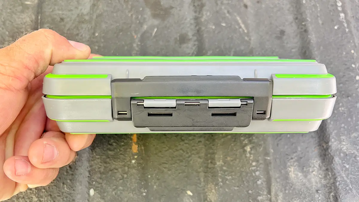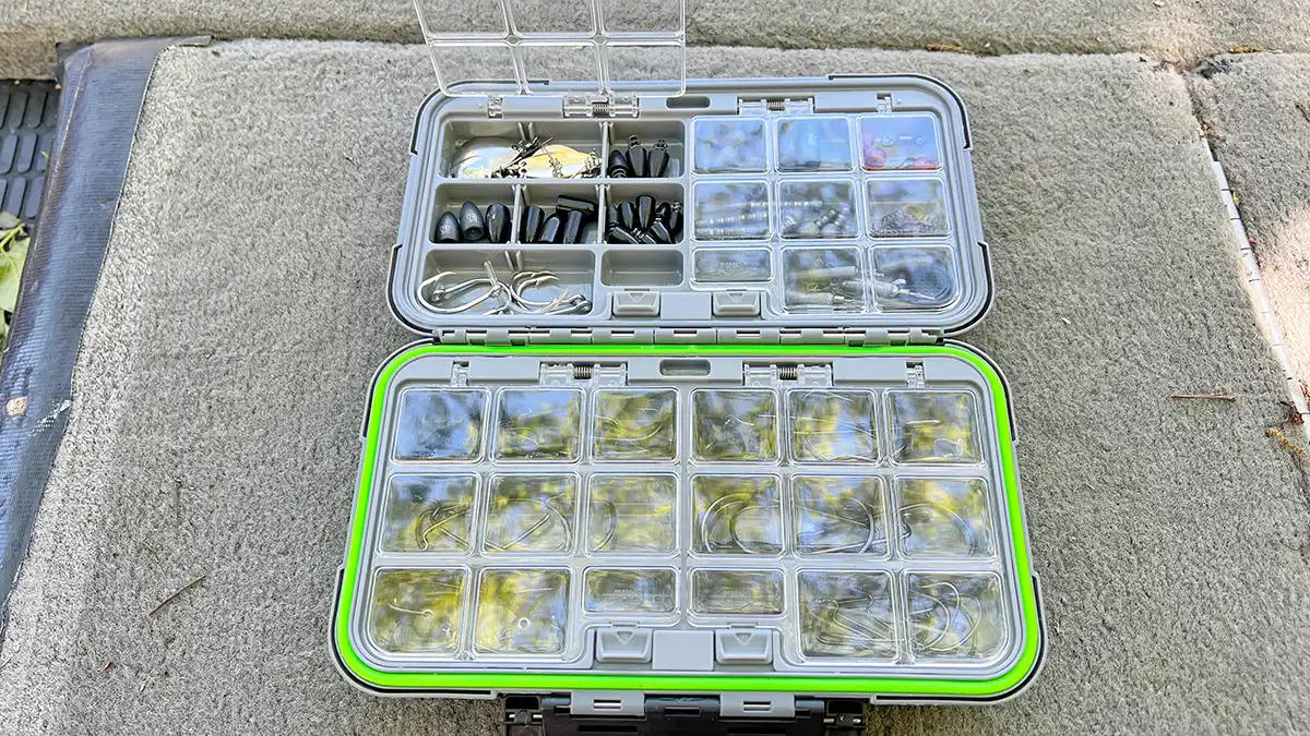 There’s a waterproof seal around the whole box that pairs with a heavy duty latch along the front to keep moisture out. This is imperative with terminal tackle storage as rust can ruin almost all of this stuff, costing you a lot of money in the process. I like the little non-skid green accents on the box as well, which make the box easy to grip when reaching for it and keeps it from sliding around in the compartment of your boat or the floor of your kayak.