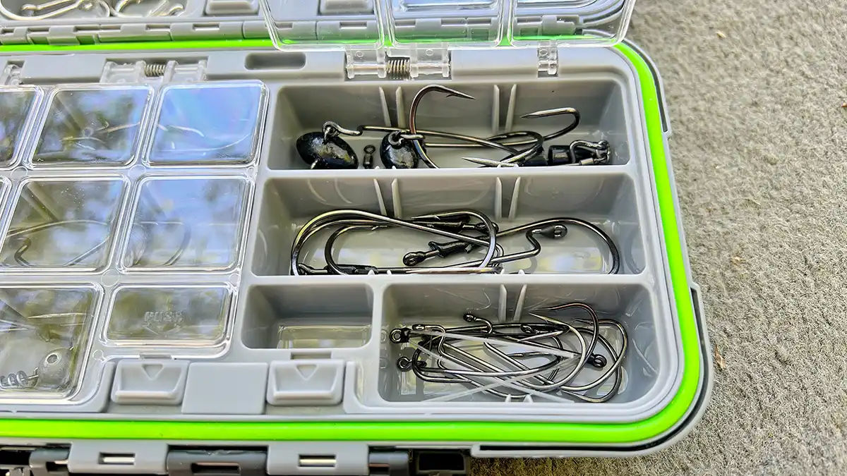 With the option to have up to 36 individual compartments, I found myself running out of smaller items to store in them. I decided to pull out a couple of the removal dividers to make way for storing a few hooks across multiple compartments. I was shocked to find that this little box would hold a 4/0 EWG hook and a 5/0 worm hook. On initial impressions, that was not my expectation just looking at it.