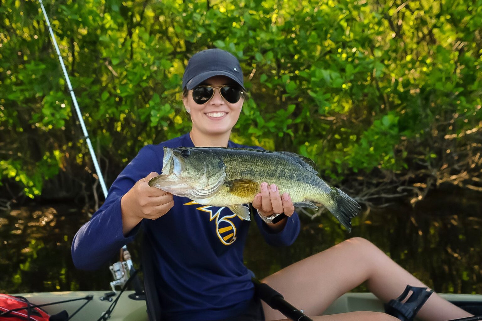 Matching the hatch can dramatically improve your catch rate. Learn what the bass in your area are eating and find lures that resemble it. Local reports can be a good starting point when trying to dial in baits. On the water, look for clues like a dead baitfish that can help you match your lure to what the bass are eating.  When I fish a lake with a lot of shad, white swimbaits are my go-to for fish that are actively cruising for an easy meal. Come summer, ponds and lakes can be overgrown with vegetation that frogs love. Fishing a topwater bait or frog pattern can trigger a reaction strike from a fish waiting under the cover.
