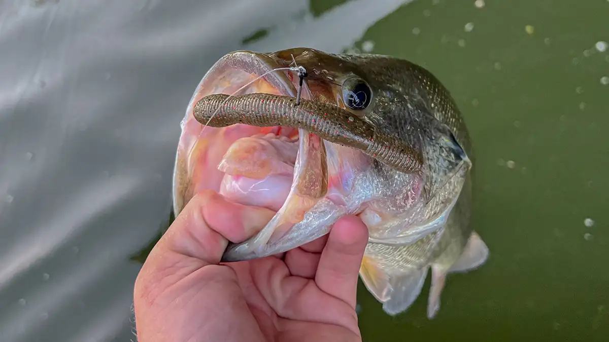 While the wacky and Texas rig are often my go-to baits, I try and use a big swimbait when applicable. This is a great option for aggressive bed fish that are actively defending their nest. Much like the wacky rig I’ll make a cast past then bed, then slowly wind the bait into the strike zone. One of my favorite baits for this application is the 6-inch Berkley Cull Shad. This approach is great for quickly covering water and hitting lots of different locations throughout the day. I’ll often only make two or three casts on a bed with this lure before switching to a more finesse approach. However, when they decide to bite this bait the strike is often ferocious.