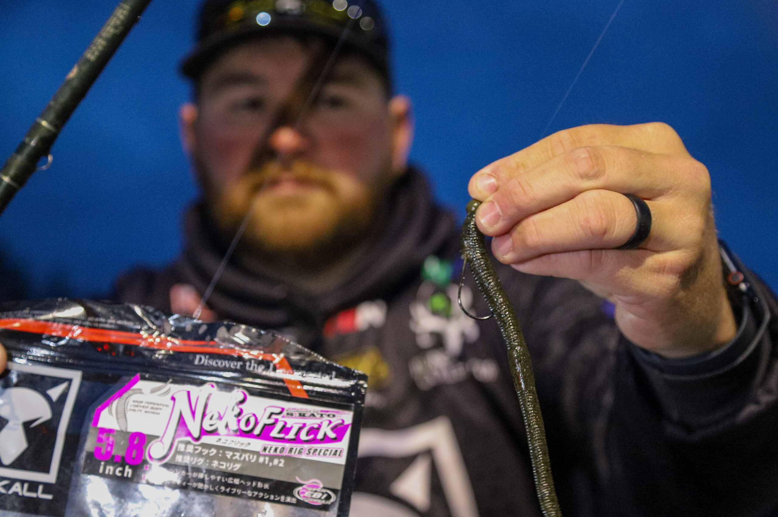 His shaky head setup consisted of a 3/16-ounce jighead and a 6.8-inch Jackall Flick Shake worm in green pumpkin that he shortened to around 5 inches long.