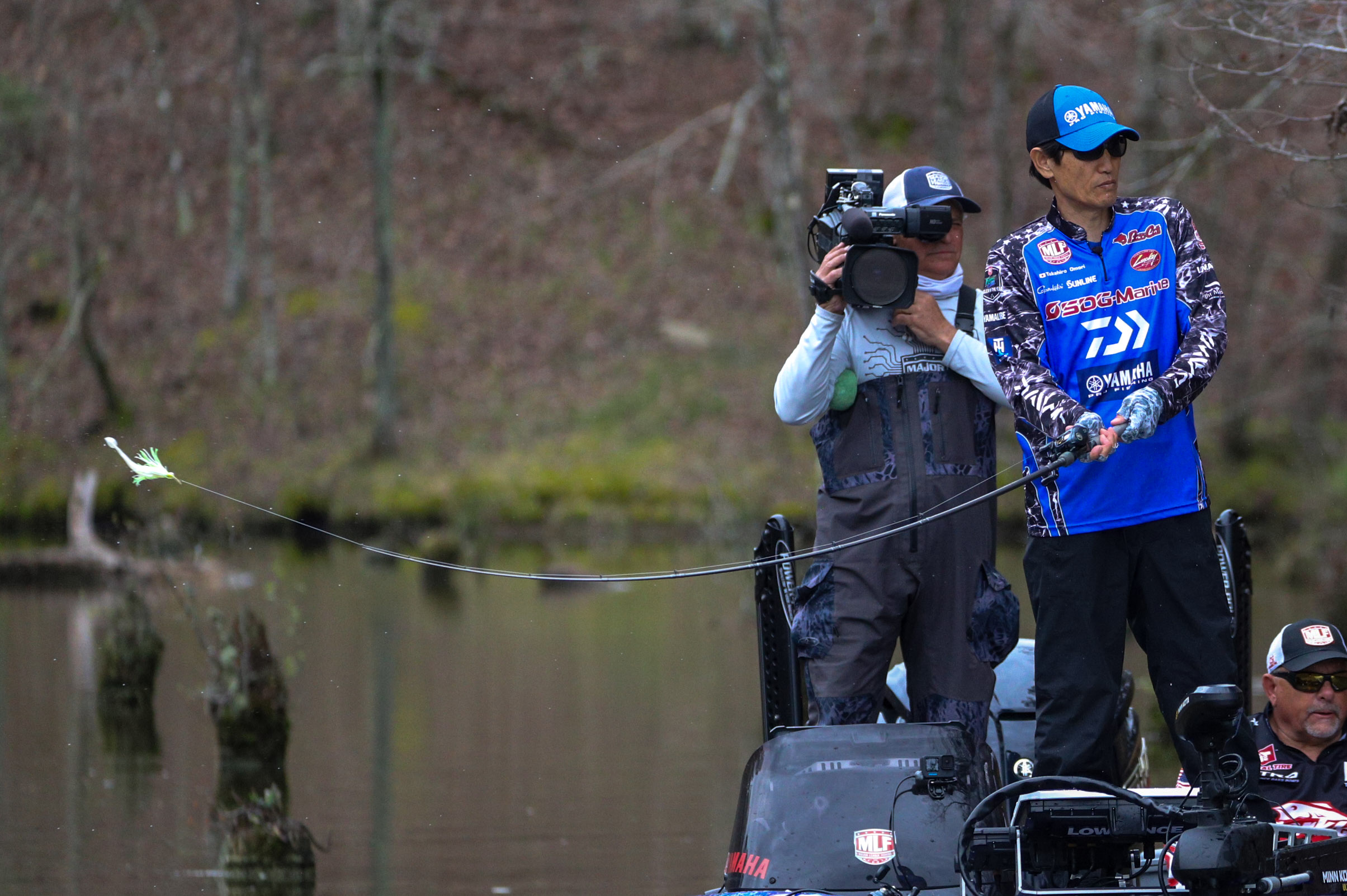 Regarded as one of the best casters by his peers, Takahiro Omori put on a trick-casting show on MLFNOW! with incredible forehand and backhand casts to shallow cover. He stuck to the shallows and did what he does best, picking everything apart with a chartreuse and white 3/8-ounce Z-Man/Evergreen ChatterBait Jack Hammer with a hot chartreuse Z-Man DieZel MinnowZ as the trailer.