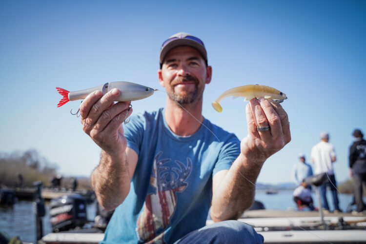 John Pearl led after Day 1 on the strength of a 29-pound, 1-ounce bag he caught mostly on a 6-inch G-Ratt Executioner swimbait (lite trout), which he helped design with Gary Collins. For that 1-ounce bait, Pearl went with 20-pound-test Seaguar Tatsu spooled on a Shimano Tranx 201 paired with an 805D Douglas XMatrix rod. He also did some work with a G-Ratt Sneaky Pete glide bait.