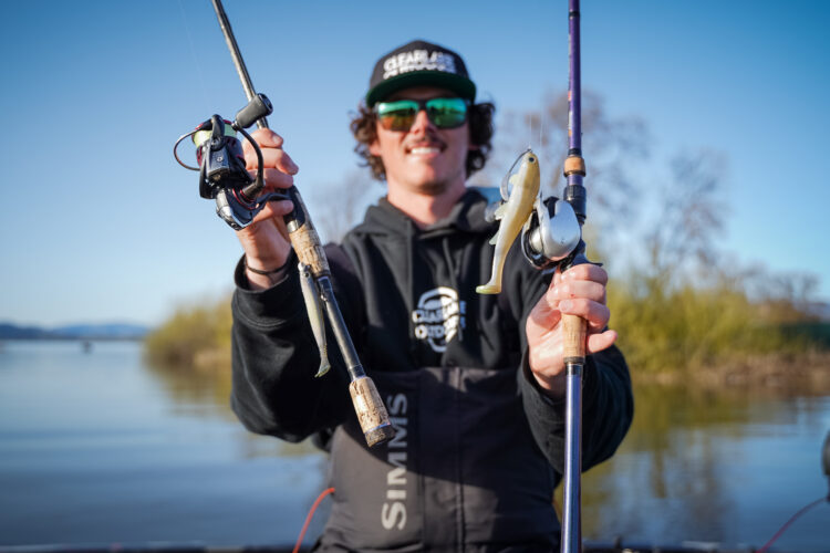 Using Garmin LiveScope, Phillips employed a pair of G-Ratt swimbaits to catch his fish, most of which came on the spinning rod and smaller 4-inch offering. For that setup, he went with a G-Ratt Thin Swim (pro blue) tied to 10-pound-test Seaguar Tatsu on a 20-pound-test Seaguar Smackdown main line. The reel was a Daiwa Ballistic and the rod a Dobyns Champion 702.