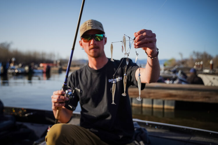 For the umbrella rigs, Touey went with an iRod Genesis III 764 rod paired with a Shimano Tranx 200. For the G Funk Cali Rig, Touey opted for 25-pound-test Seaguar InvizX and 65-pound-test braid for his stouter rig. Both were tipped with 1/4-ounce heads and 3.8-inch Keitech Swing Impact FATs (pro blue shiner), with the tails of the hooked baits dipped chartreuse.