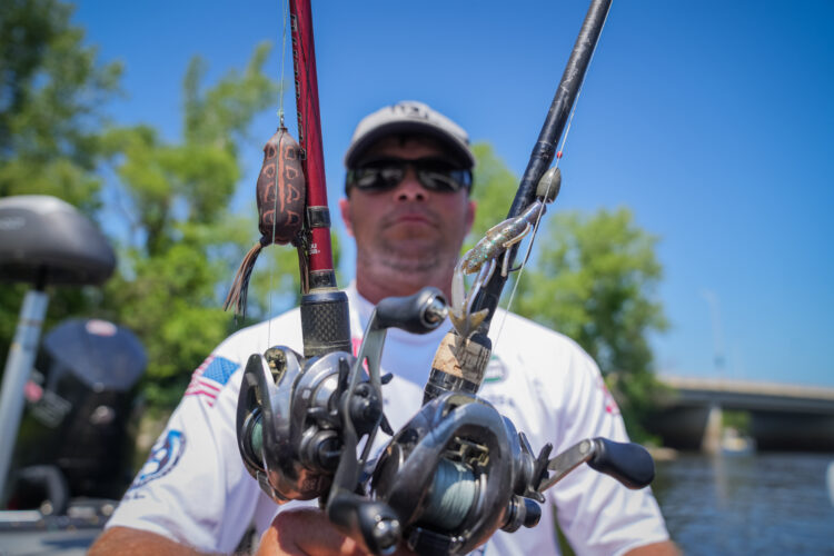 7. Star of the river Mike Brueggen resisted the urge to take the lock to Pool 7 and stuck to his guns on Pool 8, keeping a frog rod in his hand the majority of the week. Brueggen caught his fish on a variety of SPRO Bronzeye Frogs, notably in the killer gill and natural red patterns. Brueggen worked his frogs on a 7-foot heavy action casting rod with 65-pound braid spooled up. For fish that didn’t get it, Brueggen kept some punching and flipping options handy.