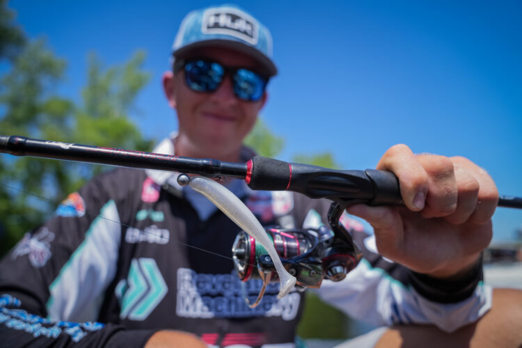 9. Drew Gill leaned heavily on his electronics after making a run to Pool 9 each day, focusing on schooling fish with his forward-facing sonar and reeling a swimbait over the top of their heads to generate reaction strikes. Gill got his bites by swimming a 4-inch Keitech Easy Shiner in French pearl pattern, with a 1/8-ounce ball head jighead. The swimmer was thrown on a 7-6, medium-light Ark Invoker Pro Series spinning rod.